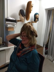 Perücke aussuchen, Freundin kommt mit. Nette Begrüßung, angenehme Atmosphäre. Schöne Einrichtung. J. hat schon viele Krebspatientinnen gesehen, überfordert mich ein bißchen mit der Ansprache. Sie gibt ihrer Katze Globuli und glaubt an die Botschaften im Wasser. Freundin kennt sie vom Film. Tauschen sich aus, uaah, weißt du noch die Zicke und der Beleuchter? Hallo, ich hab den Krebs. Können wir mal Haare? Nach der 10. Perücke gebe ich auf. Kunsthaar. Kunsthaar-Mix, Indisches Echthaar, Europäisches Echthaar. Ich schaue wahrscheinlich wie ein Pudel, dessen Herrchen mit dem Trimmer verhandelt. Kurzhaar Drahthaar.